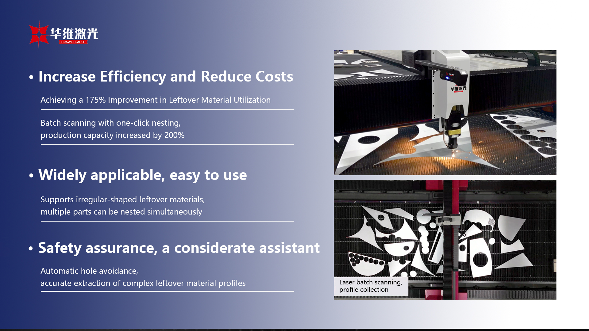 Huawei Lazer'in ağıllı qırıntıları Reutilization Sistemi nizamsız formalı qırıntıları emal etmək, mürəkkəb konturları idarə etmək və dəqiq hissə yuvası etmək qabiliyyətinə malikdir. Dairəvi, düzbucaqlı və ya qırıntıların müxtəlif nizamsız formaları ilə məşğul olub-olmaması, sistem hər material parçasından səmərəli istifadəni təmin etmək üçün yuva planını ağıllı şəkildə tanıya və optimallaşdıra bilər. Bundan əlavə, sistem, kəsmə dəqiqliyini qoruyarkən və emal müddətinin azaldılması zamanı istehsal səmərəliliyini artıran çox hissəli yuva qurur.